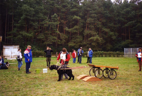 Riesenschnauzer Zemmi beim Geschicklichkeitsfahren über eine Brücke.